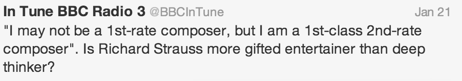 I’m concerned, too, that similar polarisation is at play already in the Strauss anniversary. Although, in this case, it’s the pitting of two aspects of the same composer against one another. This tweet from Radio 3’s In Tune sums it up: