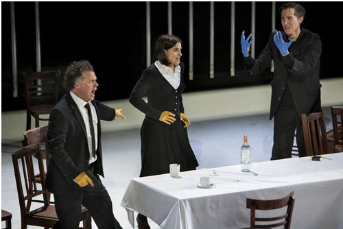 The end of the act saw the chorus, wearing various coloured gloves, constructing an endless series of suicide belts, presumably intimating that we are all complicit in prejudice and its manifest evils. Act 4, in which Rachel and Eudoxie come together in order to save the man who has betrayed them both, had their duet morph into a dance as they celebrated coming together to rise above the hatred that had hitherto permeated the opera and in washing their hands together both divested their gloves.