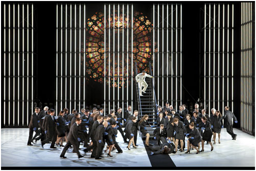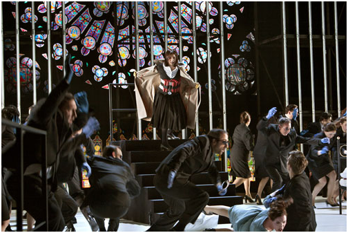Konwitschny saw the opera not primarily as Christian and Jew but as persecuting majority and persecuted minority, an essay in intolerance. To this end all wore modern dress with no distinction except that the Christians wore blue gloves and the Jews yellow. Thus he claimed to have deracinated the opera, although I doubt whether many would be convinced about this even if they might agree about his broader message. I wondered whether it was deliberate that he chose yellow for the Jewish gloves bearing in mind the yellow badge that Jews were forced to wear in Nazi Germany but which would have cut across his avowed neutral approach or whether it was an oversight. The set had a huge rose window and other stained glass at the rear, which were lit up for certain scenes and otherwise the main features were groups of vertical metal bars that were arranged in various structures according to the scene. Thus it was a fairly minimal, functional set with no indication of time or place.